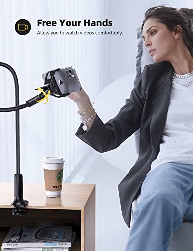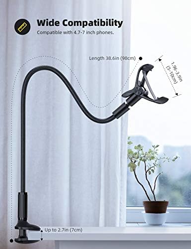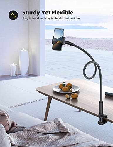 【Excellent Versatility】Featuring a screw-on clamp base varying from 0 to 2.7 inches (7cm), the bendy cell phone clip holder can be securely mounted on the edge of the bed frame, bedside, headboard, nightstand, desk, end table, chair and kitchen counter, etc.